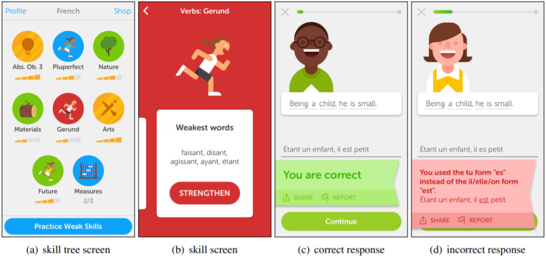 多邻国的学习过程会产生大量清晰反馈:完成/放弃、正确/错误、次日是否回归、是否续费。