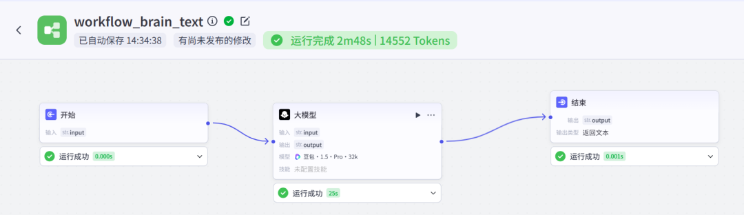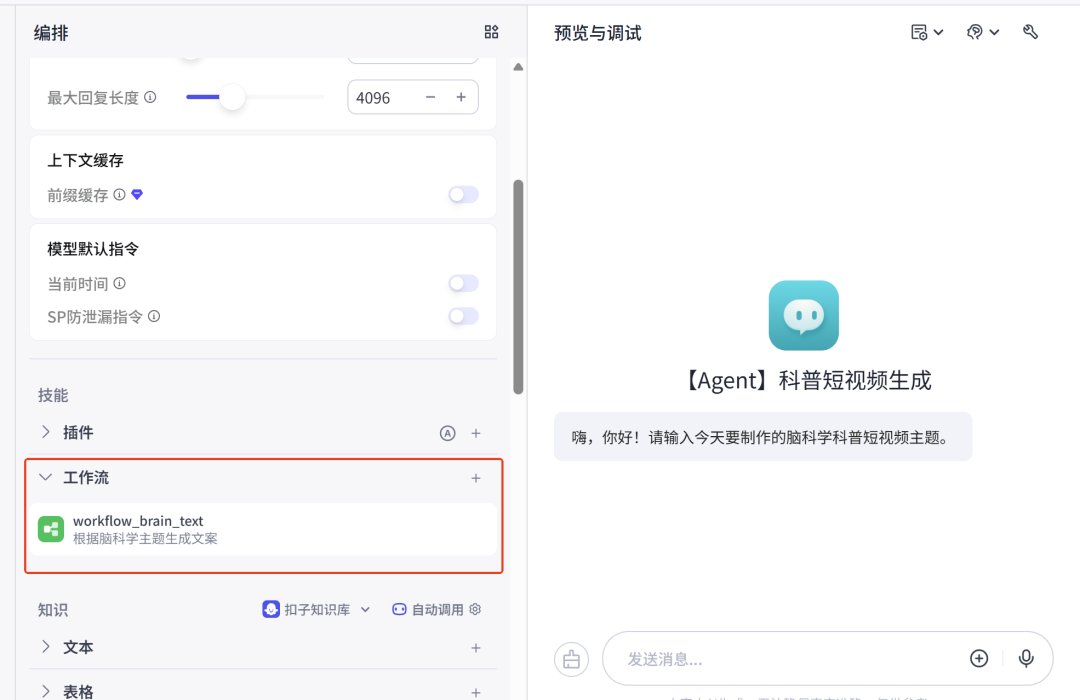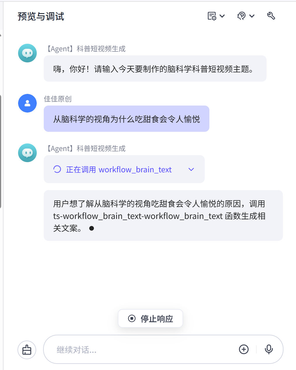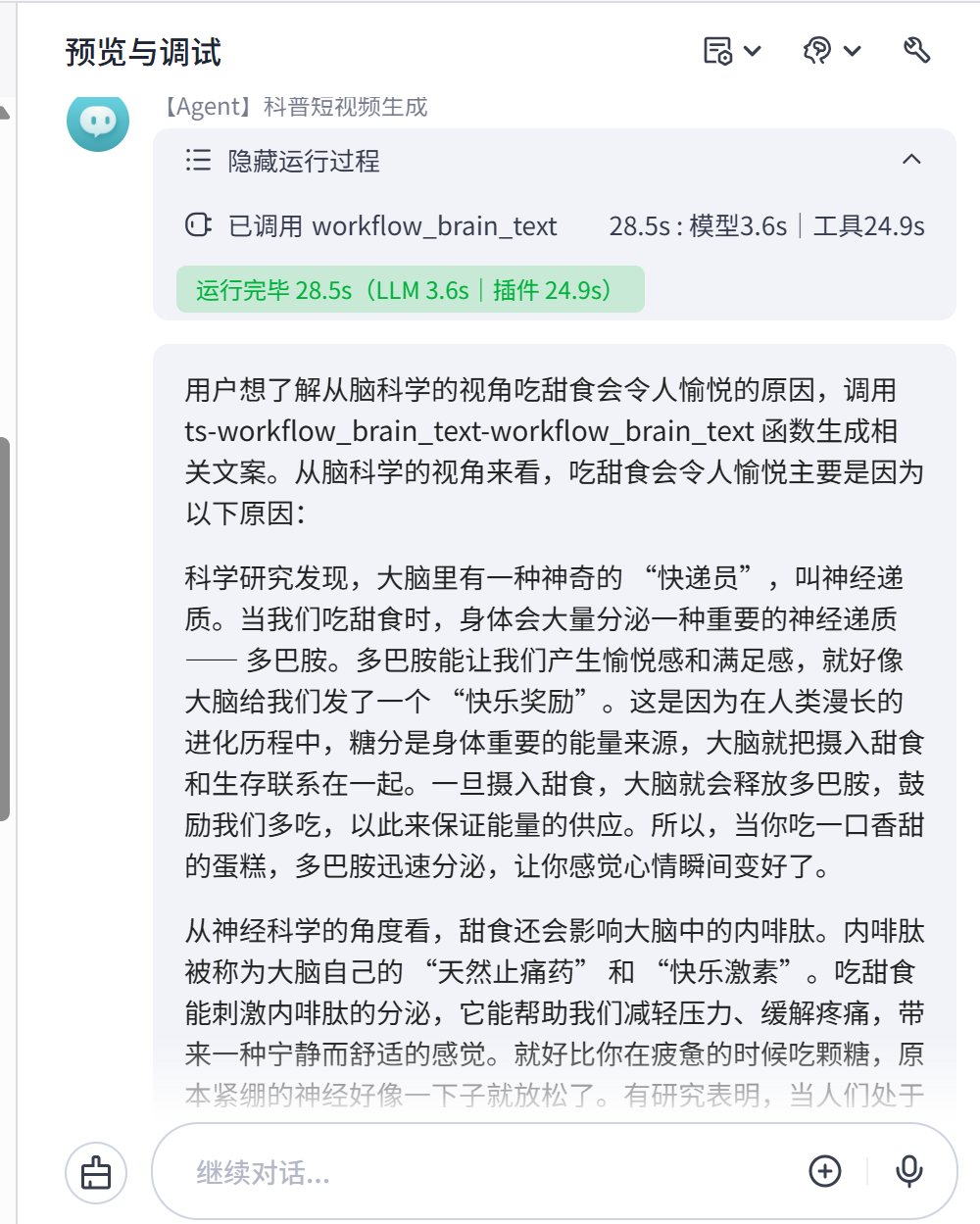 Agent开始响应我们的指令,并成功调用我们之前配置的工作流【workflow_brain_text】,生成的内容返回对话框,我们看到,已经成功生成了内容。