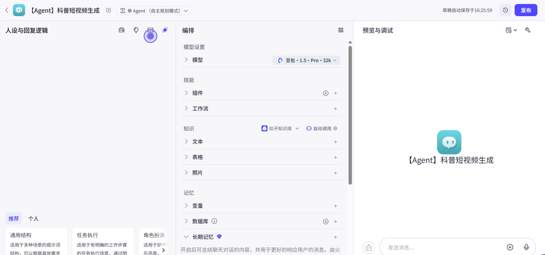 话不多说,我们直接上干货。结合我自己日常实际操作的动作和任务,我们进行每个任务节点的Agent搭建。由于Agent搭建,需要具有基础的AI工具使用经验和背景知识,因此,涉及到一些基础的操作,例如Agent平台的账号注册,如何通过提示词操作大模型生成内容,这些内容本文将不再过多讲述,如果读者有需要咨询的地方,可以联系作者。我们为Agent起个名称,“科普短视频生成”,我自己一般会在名称前加一个类型,方便后续应用比较多的时候,可以从名称上直观看出是工作流、应用还是Agent。初始界面如下图所示。