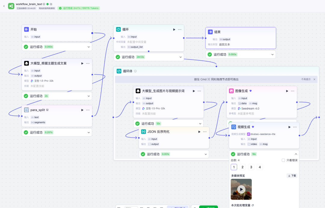我们先来实现分拆功能,通过调用分拆文案的插件,实现对我们生成的文案分拆,生成一个列表,之后调用一个循环的插件实现对这个列表中,拆分后的文案依次调用大模型生成文案。生成的结果如下图所示。