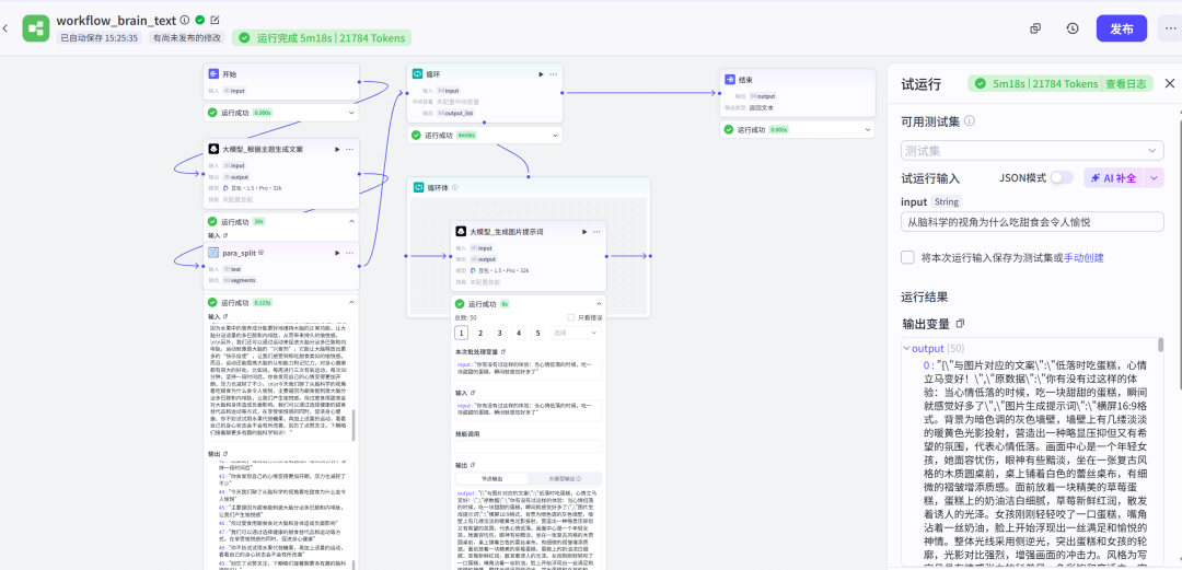 我们发现生成的内容还是比较多的,有50次循环调用,因为我们是在调试阶段,其实我们可以通过改变大模型的提示词,让大模型生成的内容稍微少一些,比如控制在100字以内。