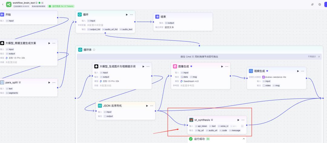 同生成视频一样,我们在循环体中加入与视频对应的文案,同时调用插件,将文案转化为音频,用于后期合成视频中的声音。