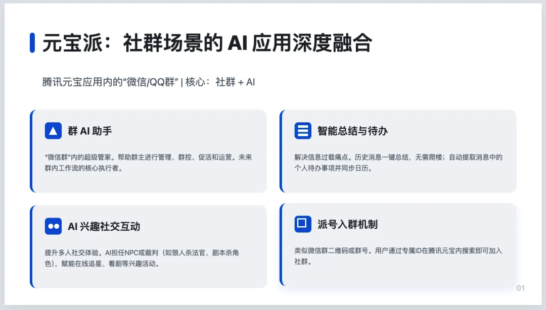 元宝派简单一点讲,就是腾讯元宝计划在自己的应用内做“微信群”或“QQ群”,在群内,用户除了发挥微信群等社区聊天的基本功能之外,最核心的功能是社群场景的AI应用结合,也就是很多人过去几年一直希望微信群支持的AI功能,现在相当于微信不做,腾讯元宝来做,具体可能包括如下: