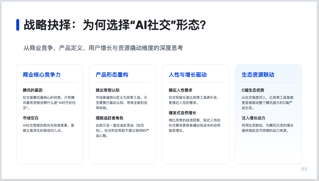 在过去一年里面,腾讯元宝的核心增长就是靠投流,烧了那么多钱,但是还是超越不了豆包,所以如果你将产品定义为一个效率工具,增长就只能靠不停地触达用户,很难实现爆发式增长,而社交是从人性的角度出发的需求,很容易撬动自然增长,只有接近人性的需求,增长才不会那么痛苦。