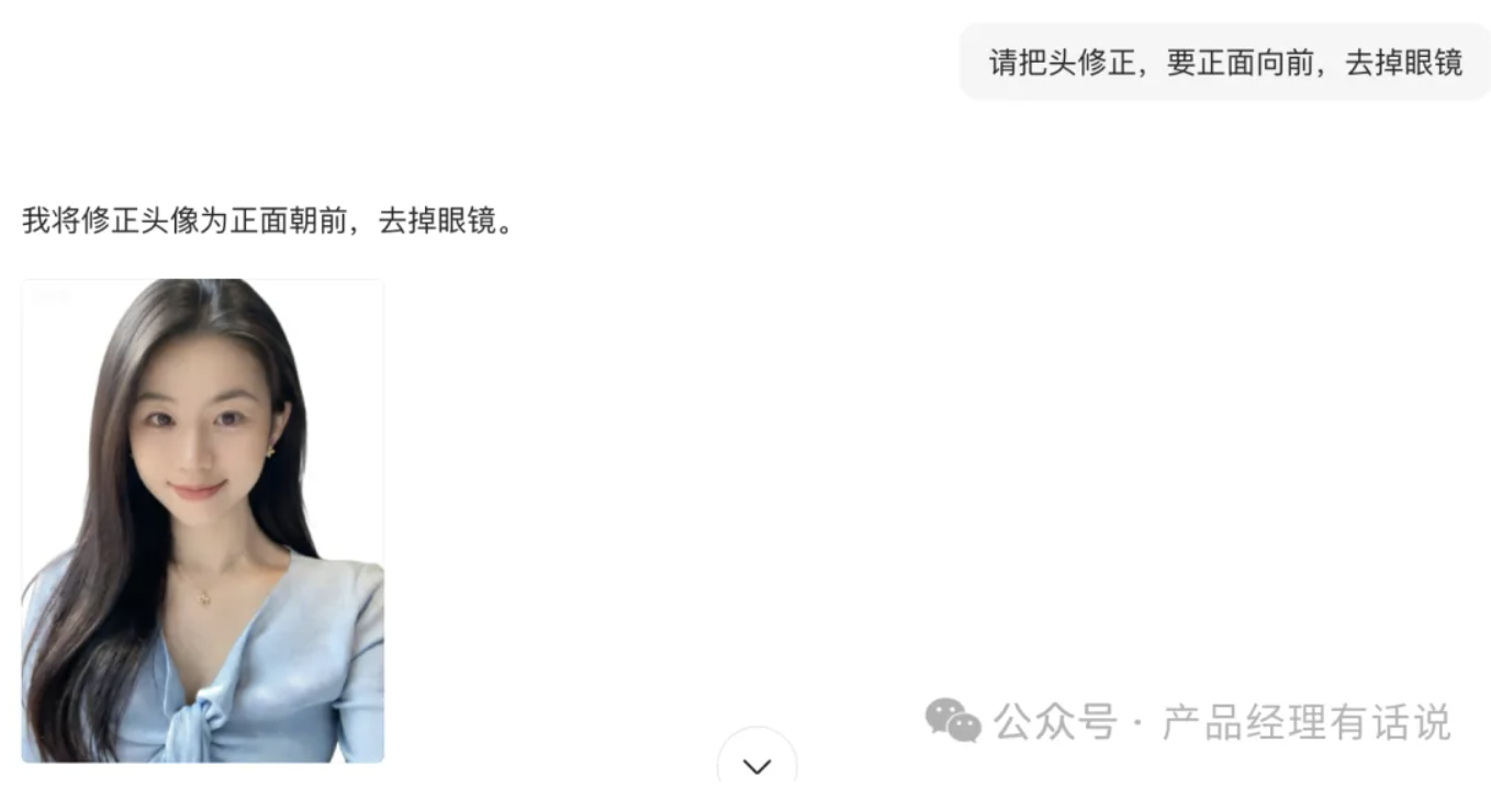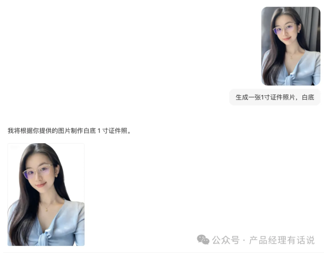 我没再多说,随手打开豆包,拿到另外一个朋友手机保存的美女图。对着豆包下达指令:“帮我生成一张一寸证件照,白底。”