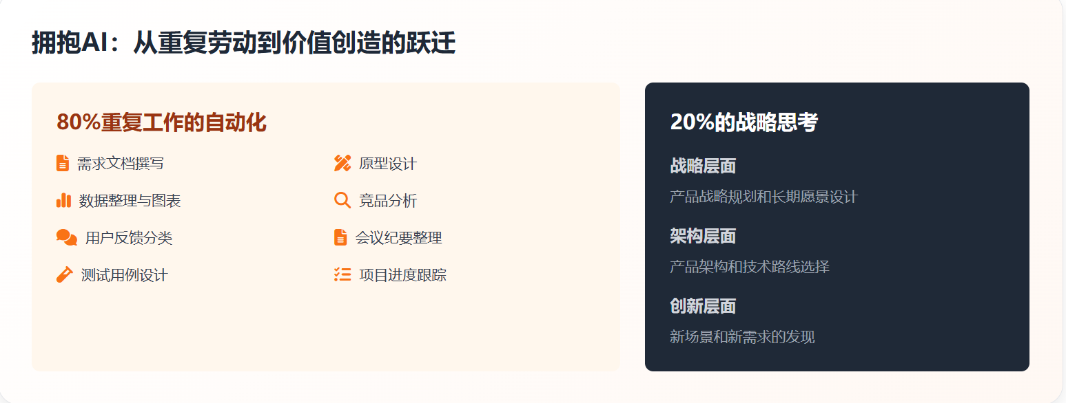 当 AI 处理了大量重复性工作后,产品经理获得了宝贵的时间用于20% 的高价值工作: