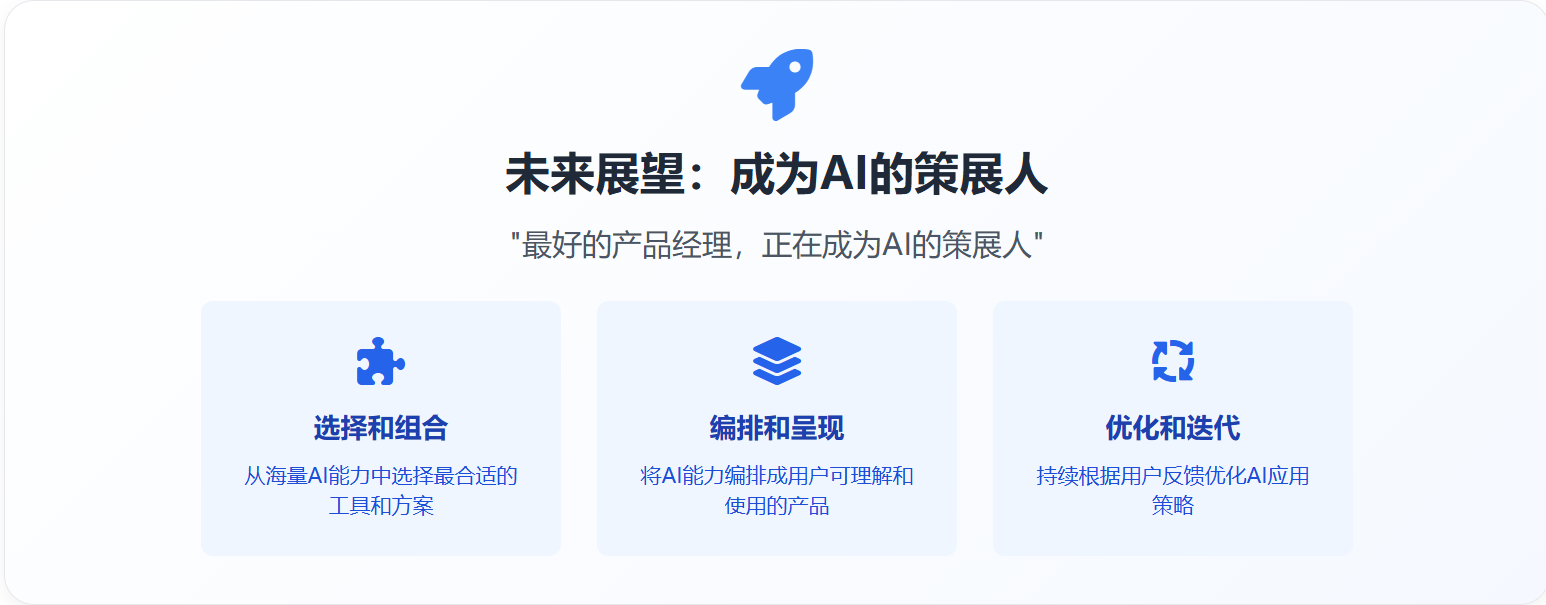 正如硅谷某 CEO 所言:”最好的产品经理,正在成为 AI 的策展人“。这个角色定位精准地概括了未来产品经理的核心价值。
