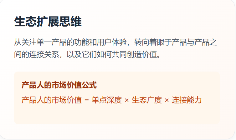生态连接者的价值公式:产品人的市场价值 = 单点深度 × 生态广度 × 连接能力。这意味着,P8 级产品经理需要开始建立生态广度(2-3 个领域),连接能力初现;而 P9 + 级产品经理则需要生态广度≥4,且具备强连接能力,能看到别人看不到的机会。