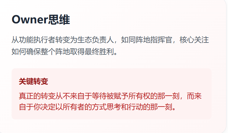 传统的产品经理往往被定义为 “功能执行者”,主要负责需求收集、原型设计和项目推进。然而,在 AI 时代,金融产品经理需要具备Owner 思维—— 如同阵地指挥官,核心关注如何确保整个阵地取得最终胜利。