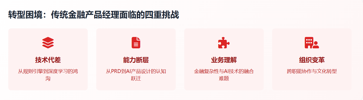 传统金融产品经理面临的首要挑战是技术代差。2025 年已有 70% 企业停用传统 NLP 模块,大模型实现跨模态推理,准确率超 90%。这种技术跃迁带来了巨大的学习压力。