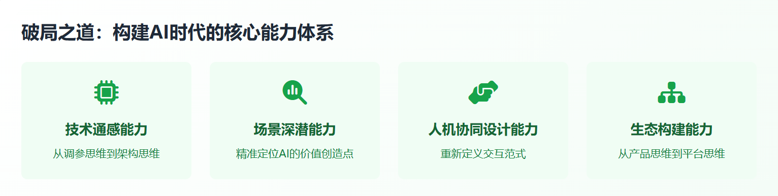 技术通感能力是基础。产品经理无需精通编码,但必须理解 AI 能力边界与限制,能够与算法、数据团队无障碍沟通。