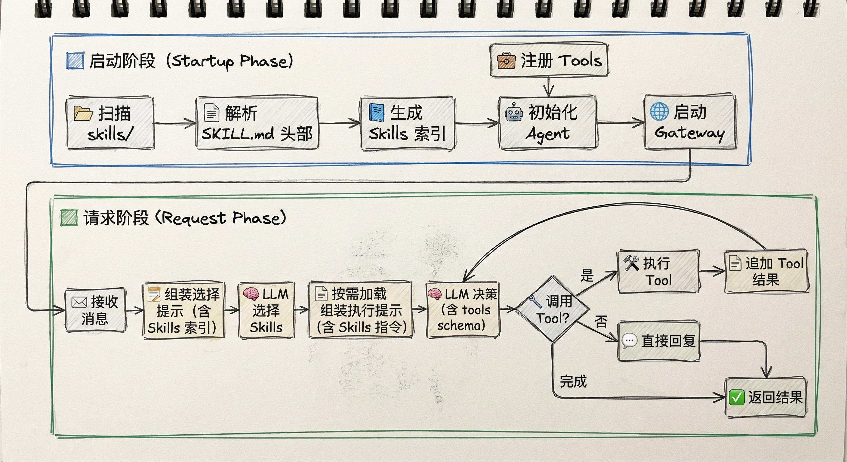 这张图刻画的是当前代码实现的真实链路:启动时扫描 skills/*/SKILL.md 只提取 name/description(技能索引),每次请求先让大模型从索引里挑选需要的技能,再按需加载对应 SKILL.md 全文拼进 Prompt,最后再决定是否调用 Tool。