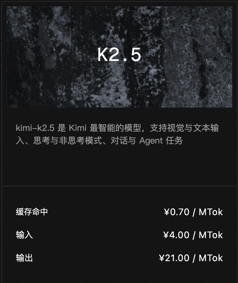 性能暴涨的同时,价格却在暴跌。Kimi 2.5 API 的定价极具攻击性: