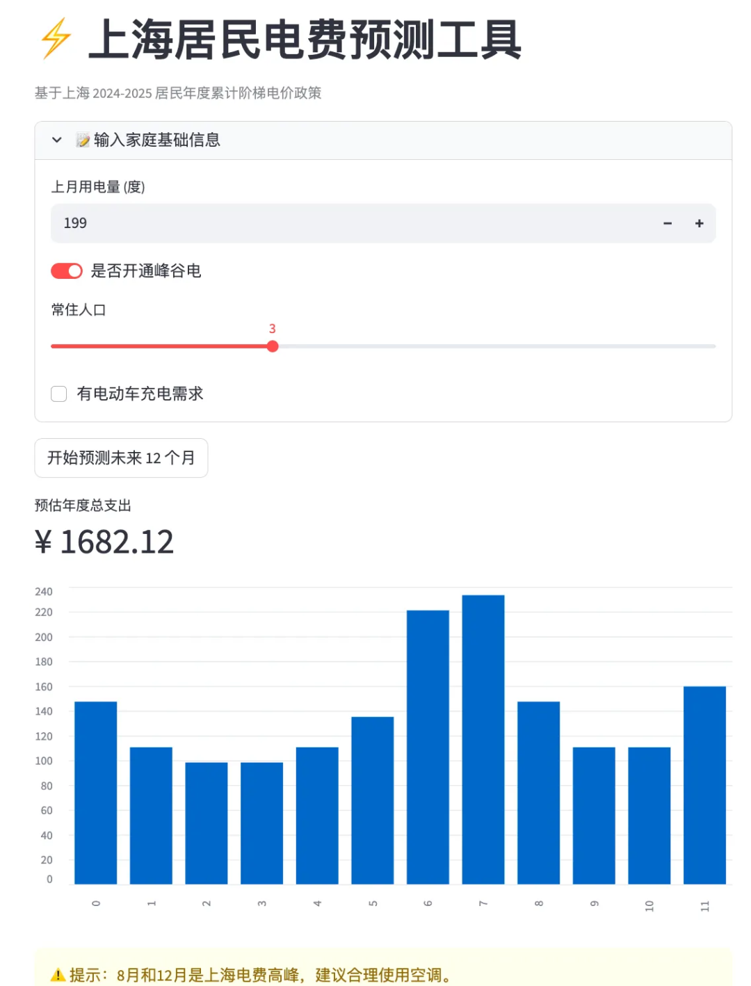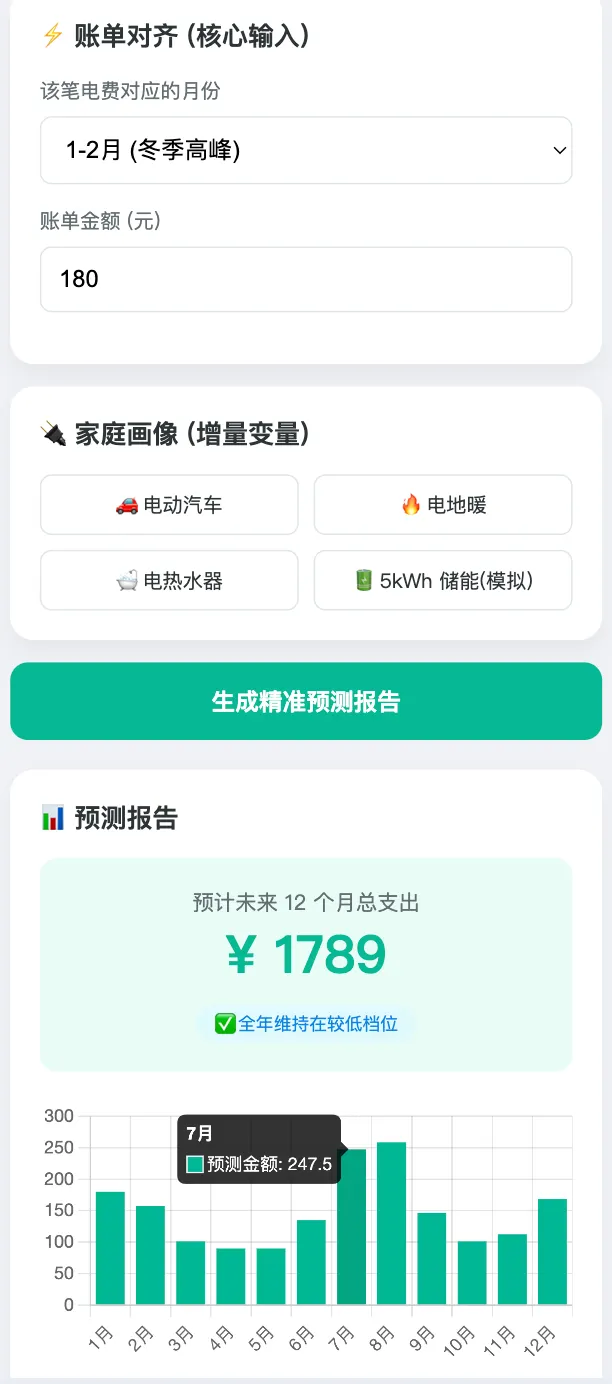 做一个中国家庭电费预测工具,能让用户通过输入尽量简单的信息完成对家庭未来12个月的电费预测