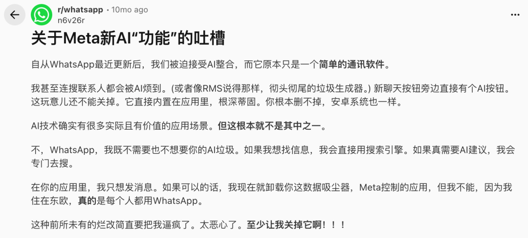 至于直接在主产品里加入AI,海外通讯产品WhatsApp深度集成了Meta AI,强制放置在应用顶部且无法关闭,引发了相当一部分用户的不满。许多用户质疑为何不能禁用该功能,认为这干扰了作为通讯工具的纯粹体验。