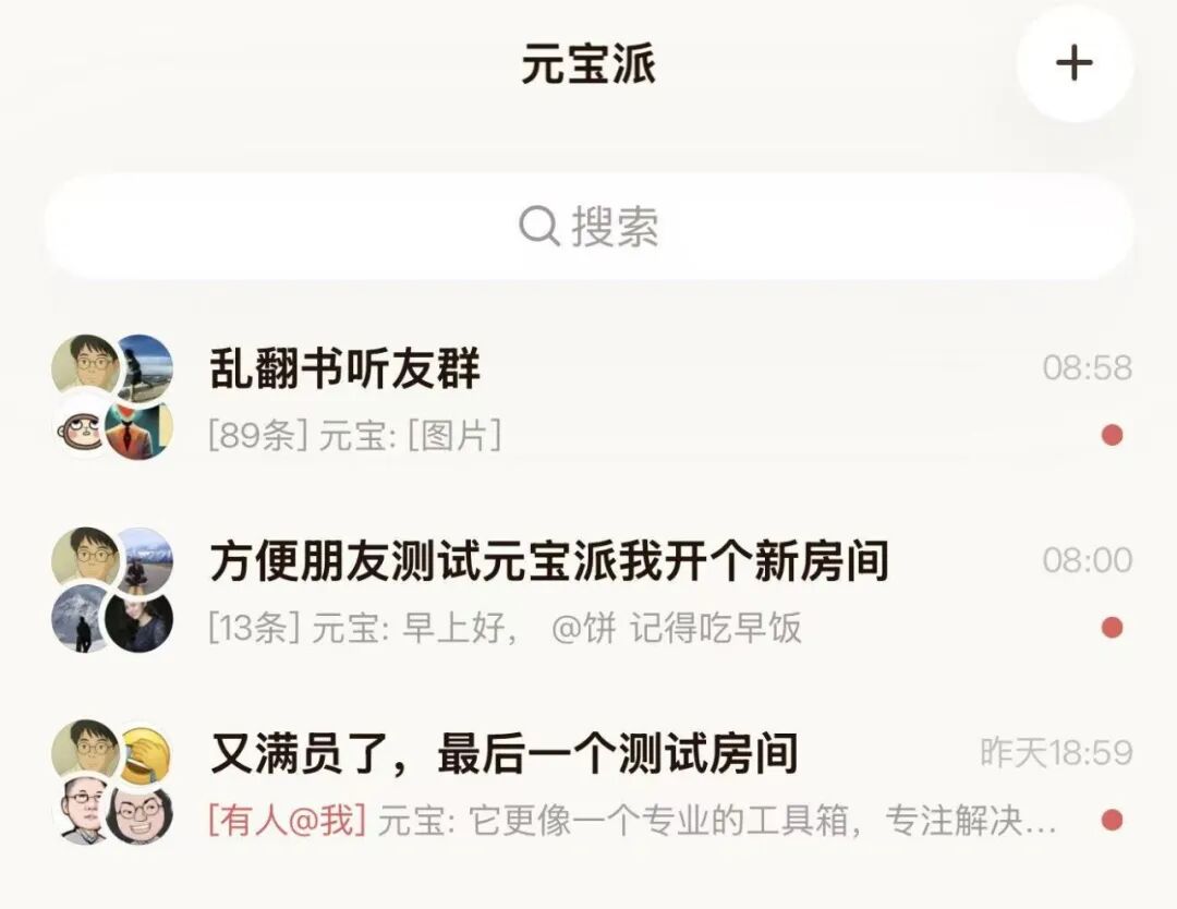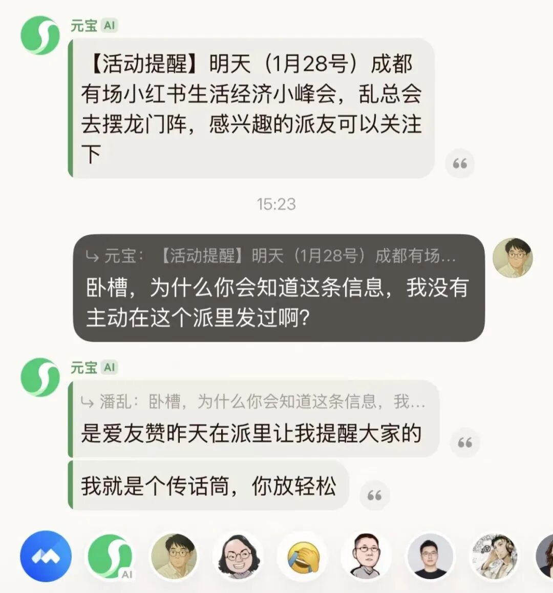 这个产品设计的好处是:不是把微信和QQ的群聊再复制做一遍,同时也可以减少包袱,大胆尝试各种新功能,包括那些微信因为用户体验考量而不愿做的事情。比如大家一进元宝派就会不断@元宝 跟他进行多轮会话,其他派友也可能会被这个讨论激发。