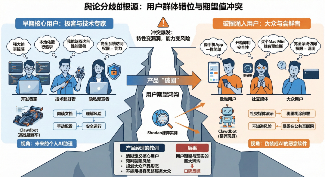 这就是产品从“服务一小群专家”到“走向大众市场”时,必然会遇到的“鸿沟”。一个对极客来说是“特性”的功能,对普通大众可能就是“漏洞”。Clawdbot的创始人可能压根就没想过他的产品会被这么多非技术用户使用,他的文档里也提到了安全风险,但他显然低估了信息传播的速度和广度。