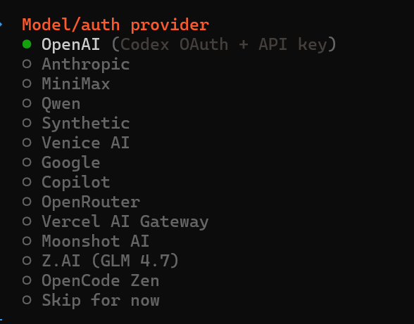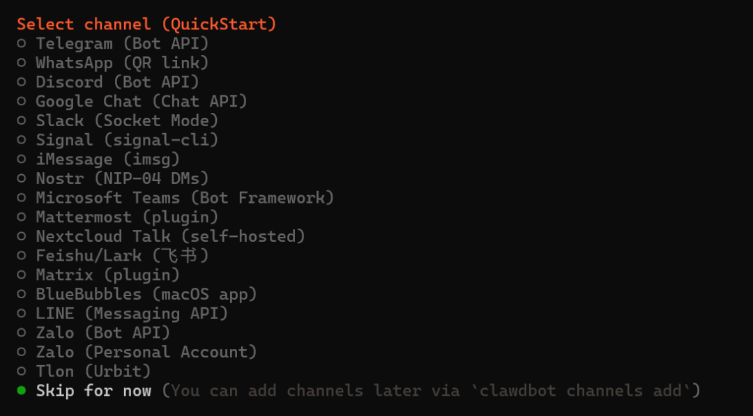 选择Skip for now。(这里就是选择用什么去操控,由于我用的飞书,在下一章节会写,这里就跳过)