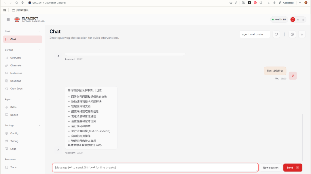 配置完成后,它会自动开启18789端口。你可以先在浏览器访问http://127.0.0.1:18789/感受一下和它对话。(如果没有反应,可以看文章末尾解决办法)。