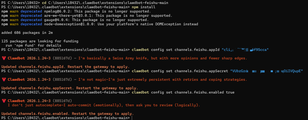 然后以管理员身份在本文件夹运行下面的命令进行安装即可(把第一步获取的飞书 App ID 填入 Moltbot 的配置中。)。