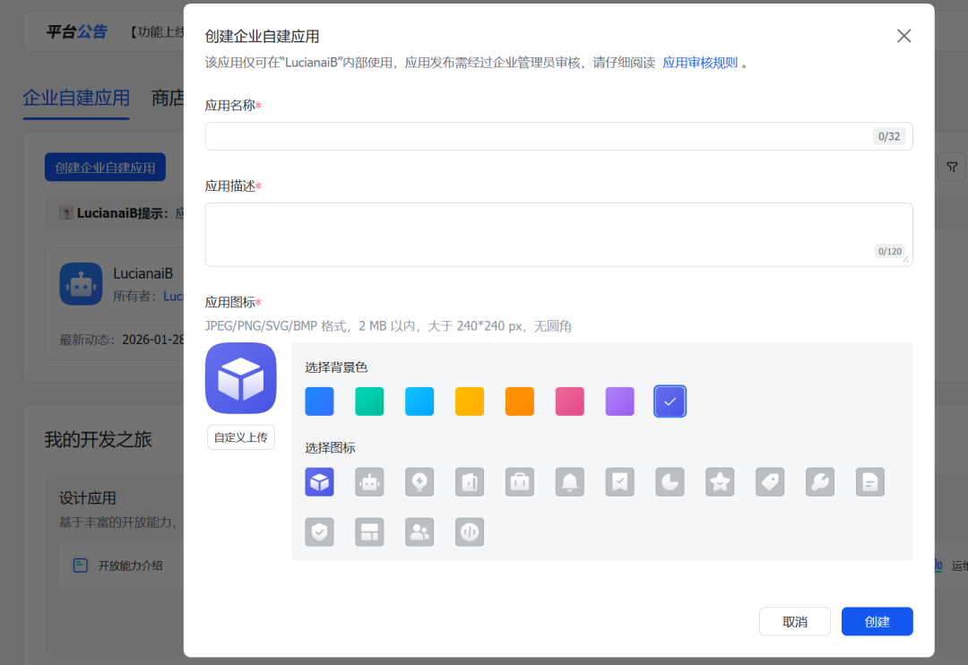 1.打开飞书开放平台配置:https://open.feishu.cn/app,新建一个,输入相关信息。