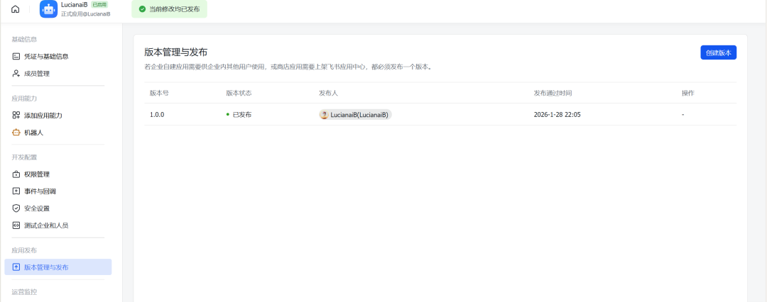 6.最后就是插件一个版本进行发布即可,点击左侧“版本管理与发布” -> 创建版本 -> 申请发布。。