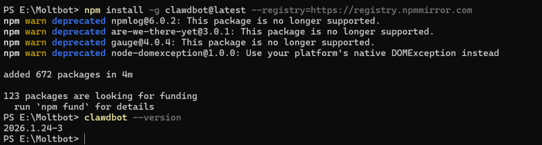 npm install -g clawdbot@latest –registry=https://registry.npmmirror.com
