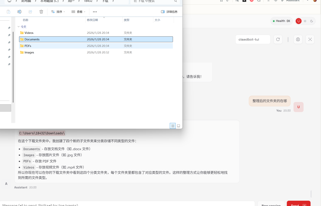 不由的我们需要思考,给AI的权限是否过大,例如他会删除移动文件等操作,会产生不可逆的操作,目前没有人敢在自己的本机操作,基本都是用到的虚拟机或者云服务器。目前 Moltbot 可以直接接管一台电脑,真的会替代人的工作吗?我也是用了有些后怕,我做了一个测试,整理下载文件夹,没想到,效果非常的不错。