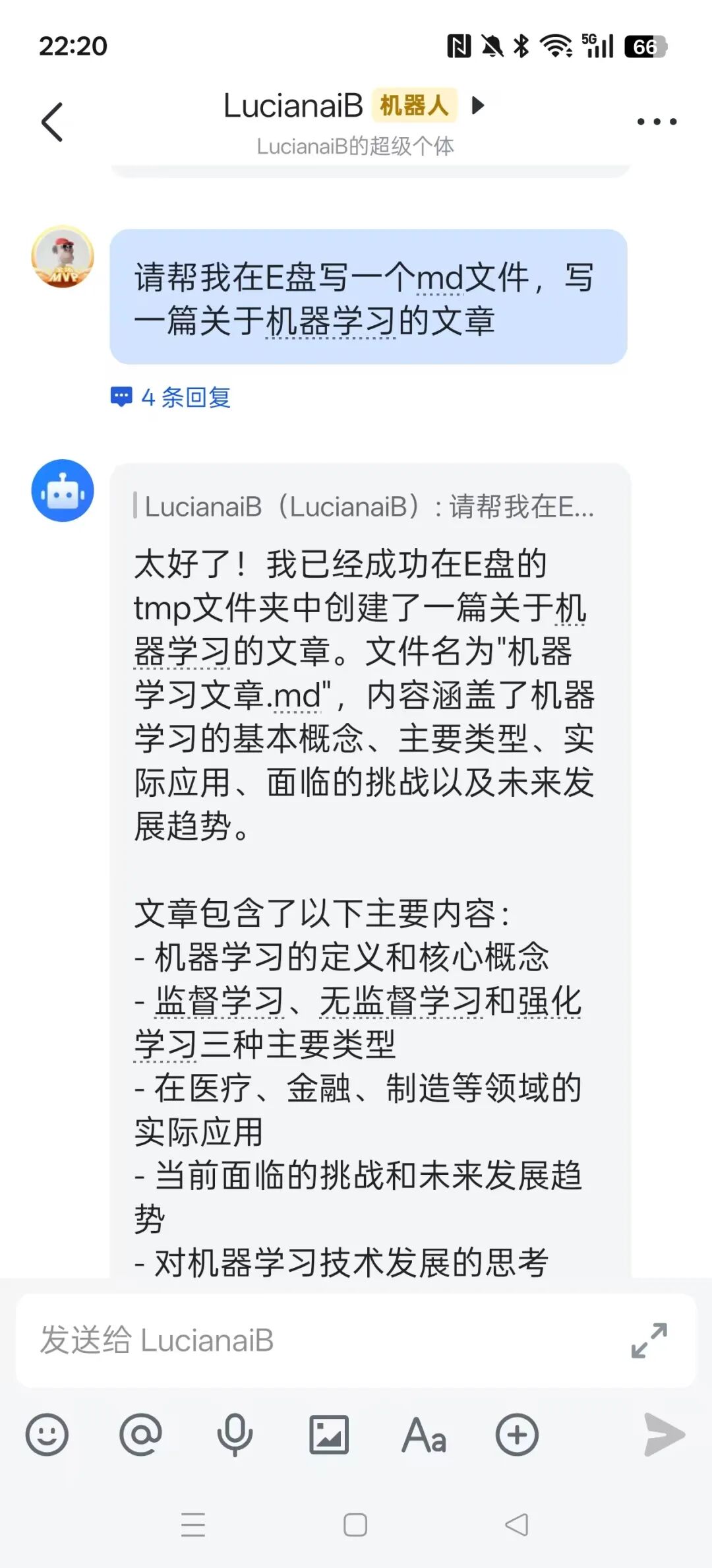直接在飞书中搜索刚刚插件的机器人给他命令即可,这里我让它给我写一篇文章。