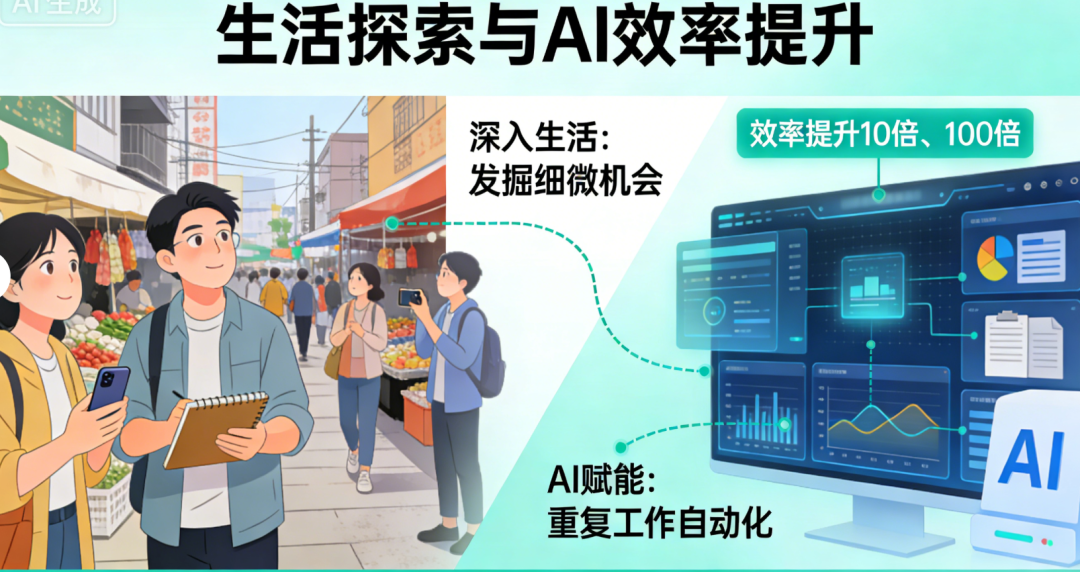 这需要我们与更多人接触,更深入生活,更深入社会去才能找到这些细微的机会,要更多的好奇心,更强烈的探索欲望,更认清现实世界和网络世界的差异点,那许多尚未被满足的需求。而过去许多不断重复的工作,很多都可以由AI来处理了,或者利用AI来达到过去10倍,100倍的效率提升。