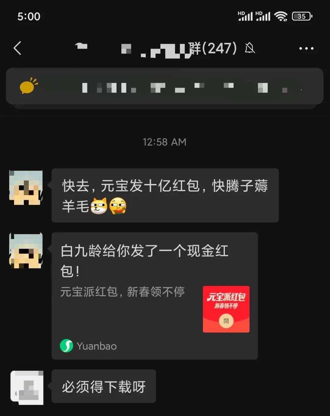 昨天凌晨一点在一个群里看到有人发了条“元宝发十亿红包”,随即就是一个红包链接