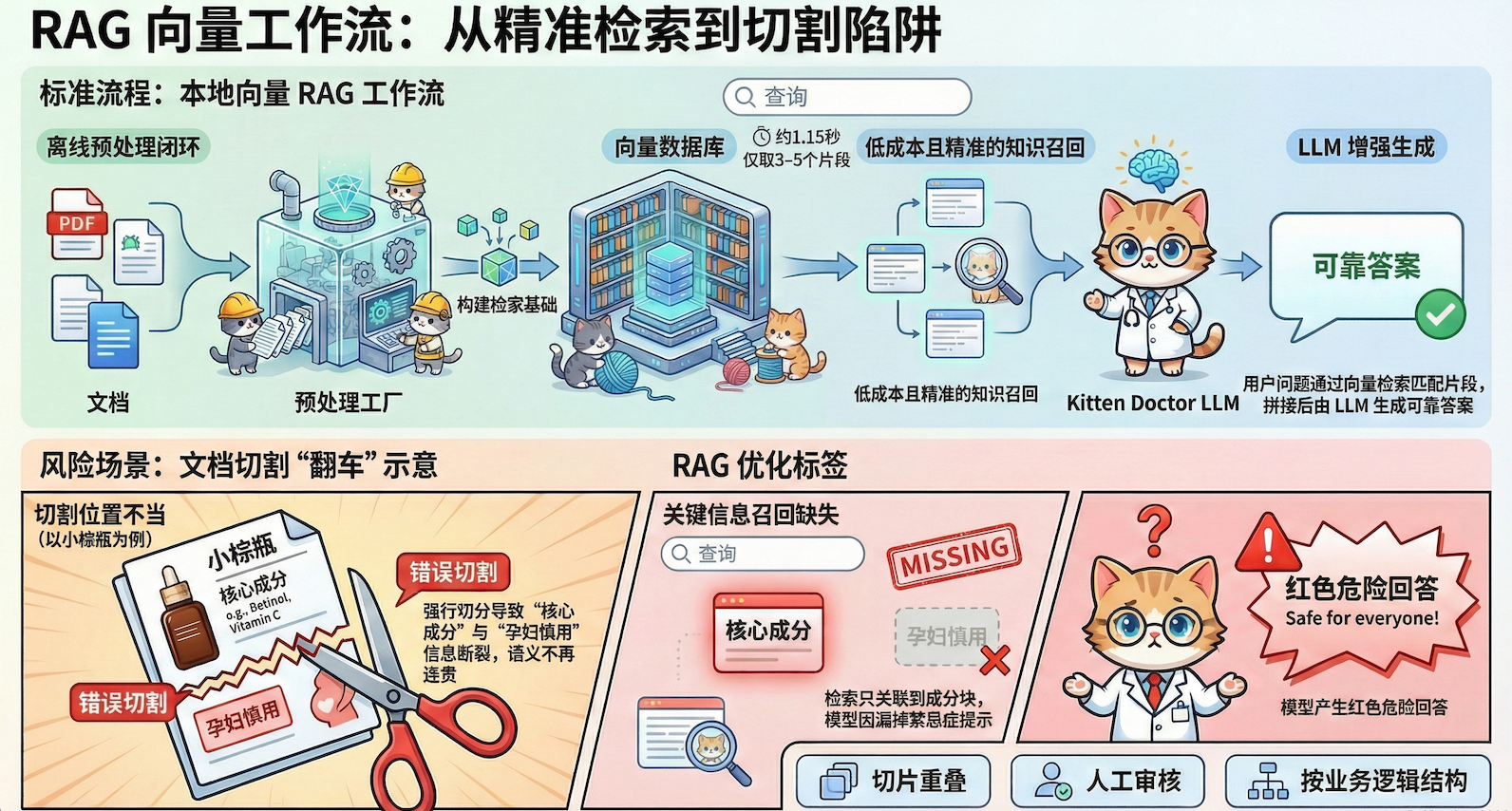 不是建个向量库就完事,文档切割需要人工把控、质量审核、策略设计。切错了会导致长期性的系统错误,甚至业务风险(比如智能客服答错产品信息)。