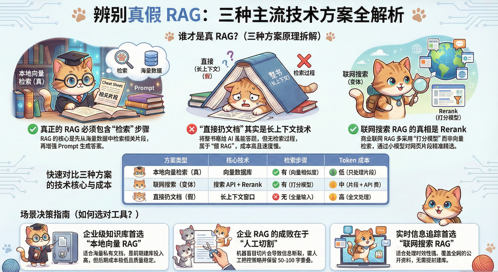 RAG技术正被广泛讨论,但市面上混杂着三种截然不同的实现方式。本文将撕开伪概念的面纱,直击'直接扔文档'、联网搜索与本地向量检索三类技术的本质差异,揭示为何60%从业者对联网搜索RAG存在根本性误解,并剖析企业级向量检索在文档切割环节隐藏的致命陷阱。