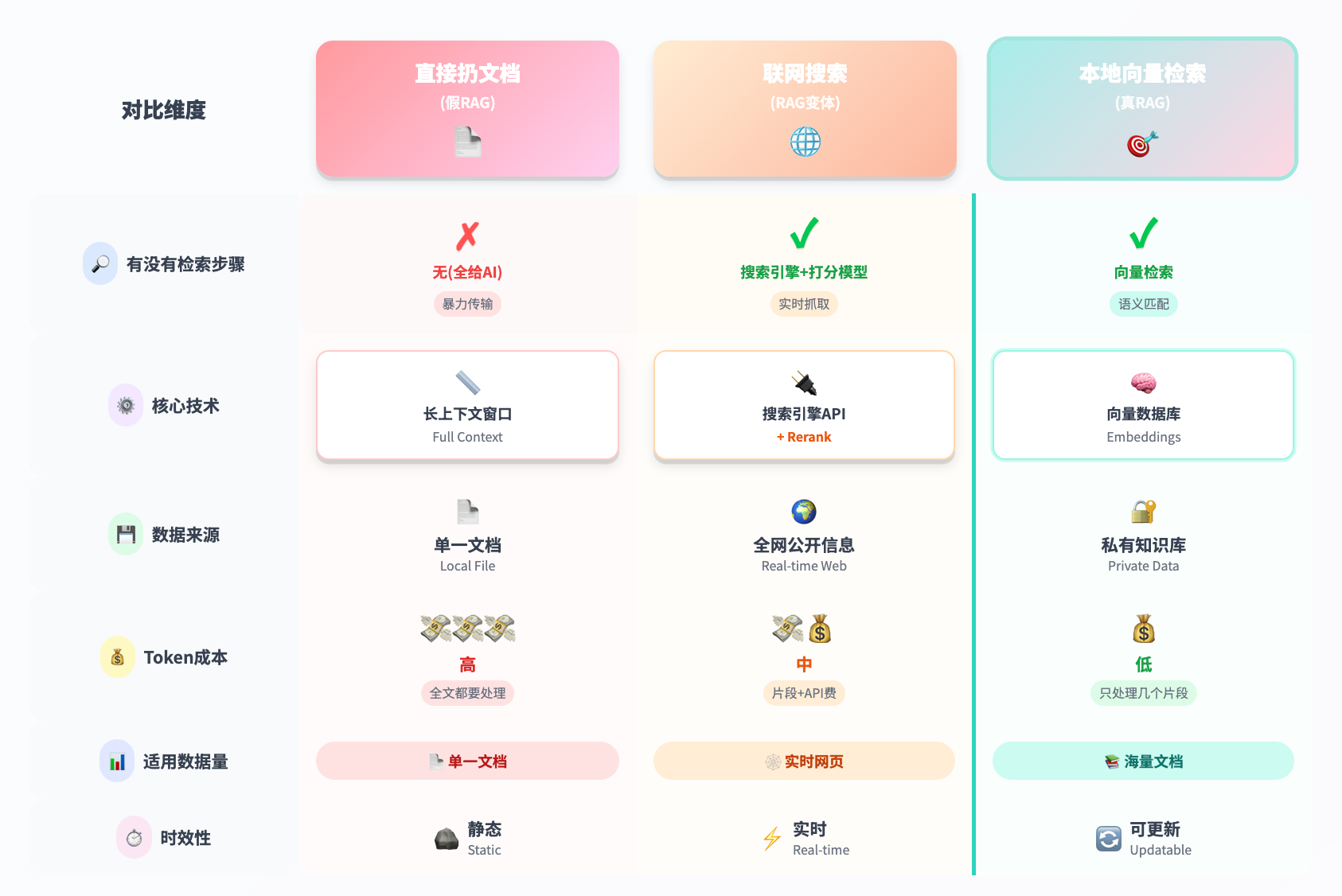 • 企业级知识库、海量数据?老老实实建向量库,前期投入高但后期省心。