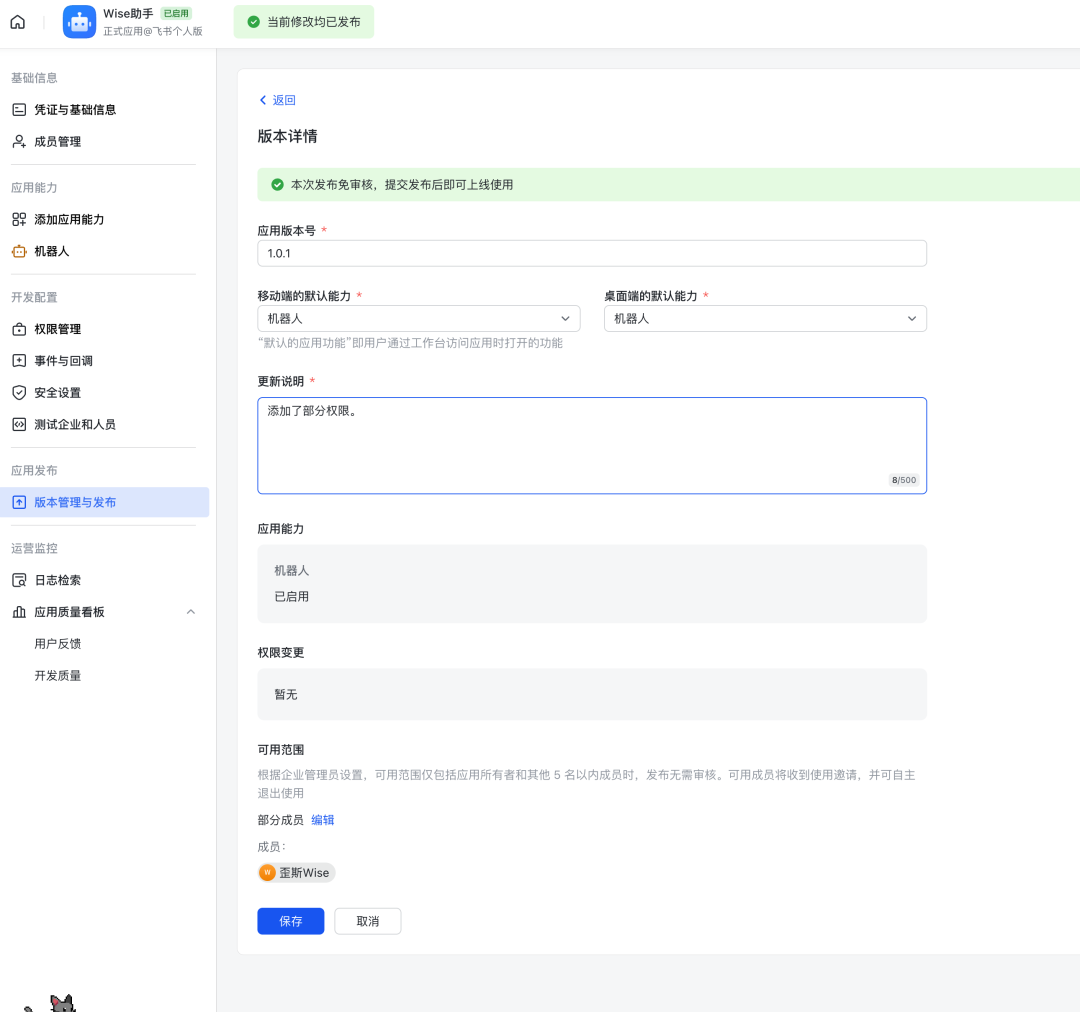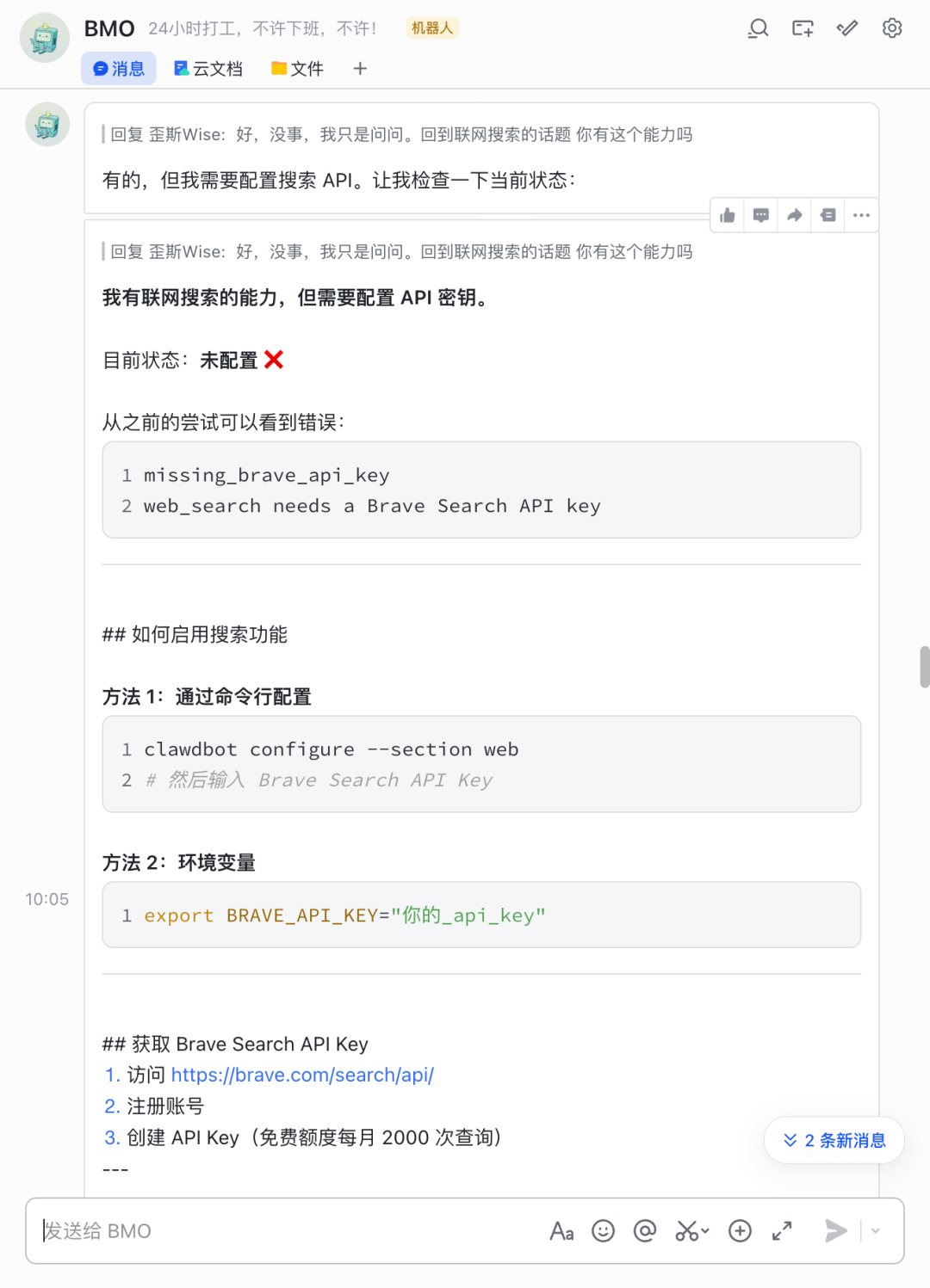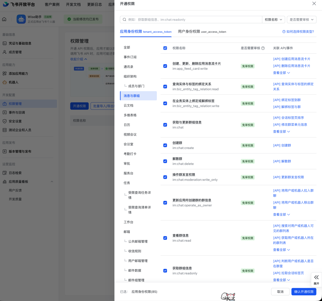 过程中遇到了问题,可以直接问飞书的智能助手,我遇到过无法和机器人对话,发现是我权限和事件没弄,问了智能助手之后就解决了这个问题。
