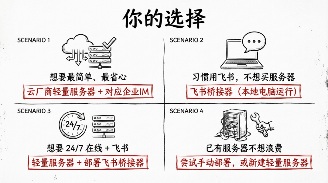 比较简单和省心,原则上使用云厂商+对应企业IM就好了,不想买服务器可以用飞书,如果想要7*24小时在线,自己电脑关机也想运行那还是得上服务器了。