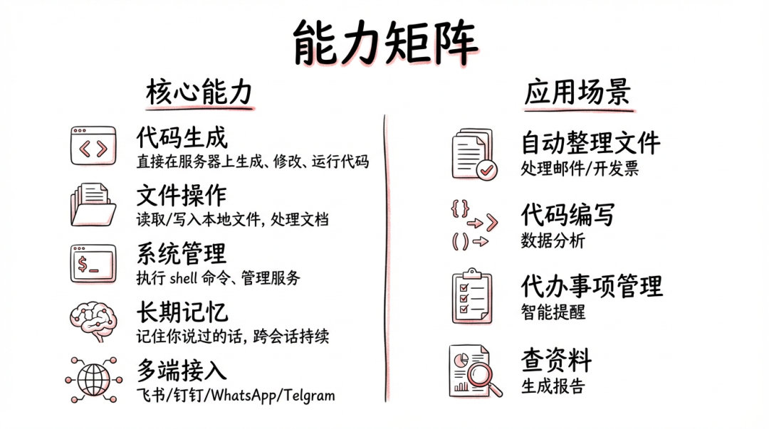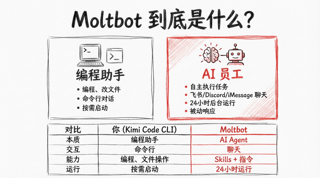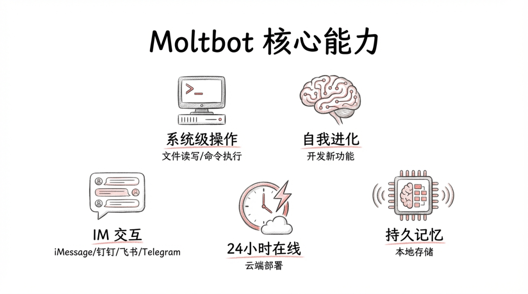 简而言之:Moltbot是一个能在服务器上跑的 AI,能真正干活的 Agent,不是只会聊天的废物。