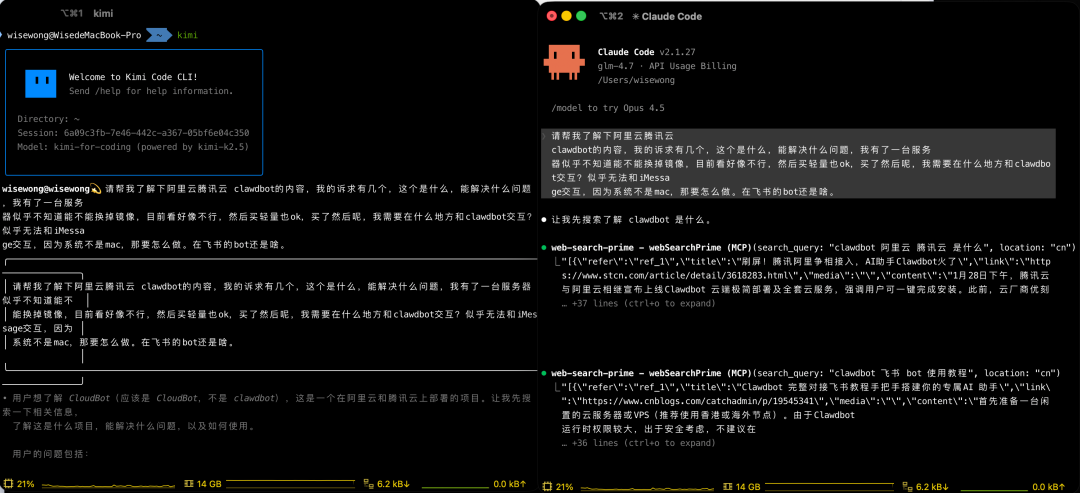 今天我们就用Clawbot这个最近很火的项目,用新出的Kimi code和Claude code(glm)来完成Clawbot从调研到部署,到应用的全过程。