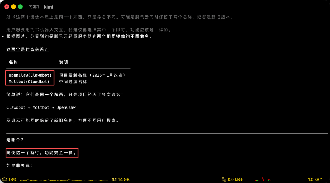 在买服务器的时候,这里Clawbot出现了2个,其实我不知道有什么区别,我继续去问Kimi,它是具备及视觉理解能力的,我很好奇它是否能否识别我的红框位置。
