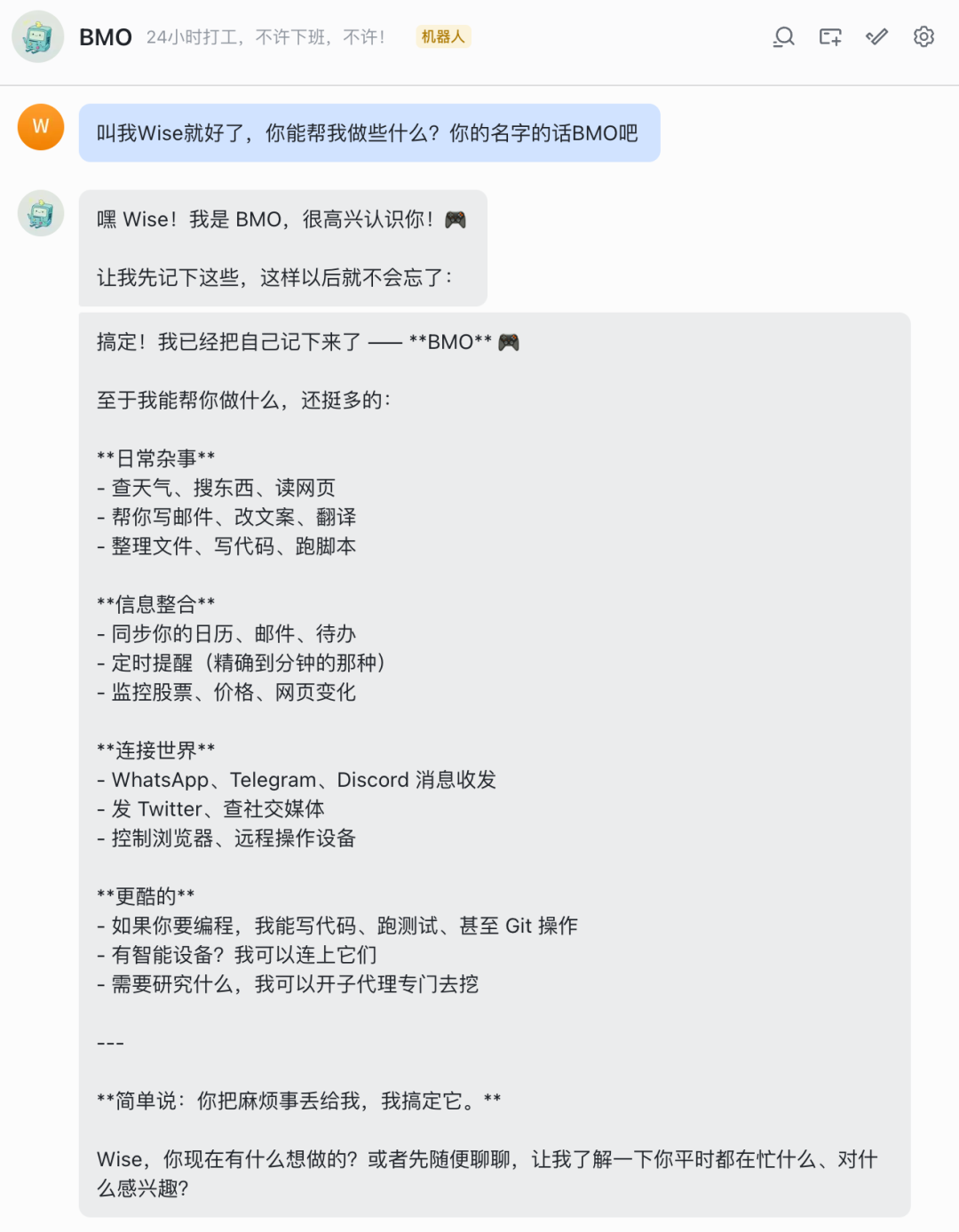 iMessage 只能在 Mac 上用,但服务器一般都是Linux,所以我们又要换种方式交互,目前企业用户基本都可以用企微、钉钉,非企业用户可能建议是用飞书的机器人或者在浏览器访问。