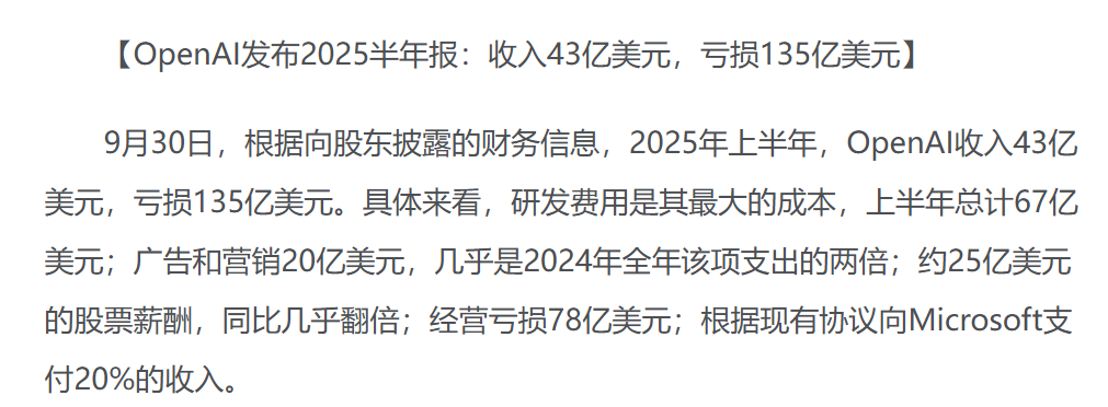 2025年第三季度,微软因为OpenAI亏了31亿美元,倒推一下,OpenAI单季度亏了115亿。