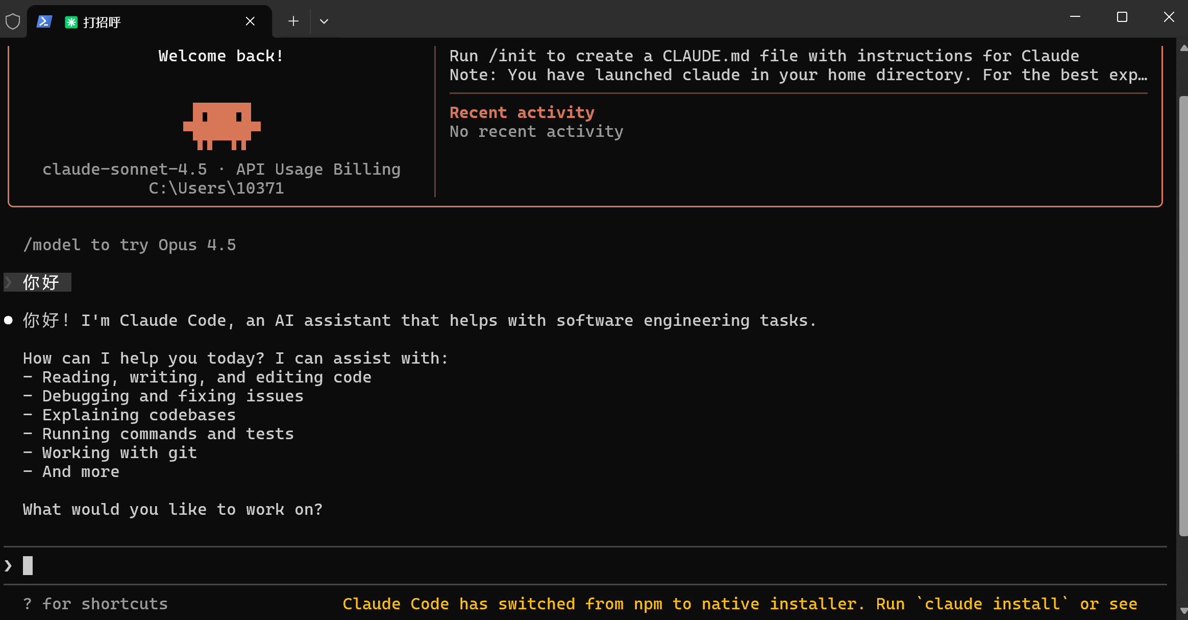 你也可以在 PowerShell 中直接输入 claude code启动命令行版进行使用。
