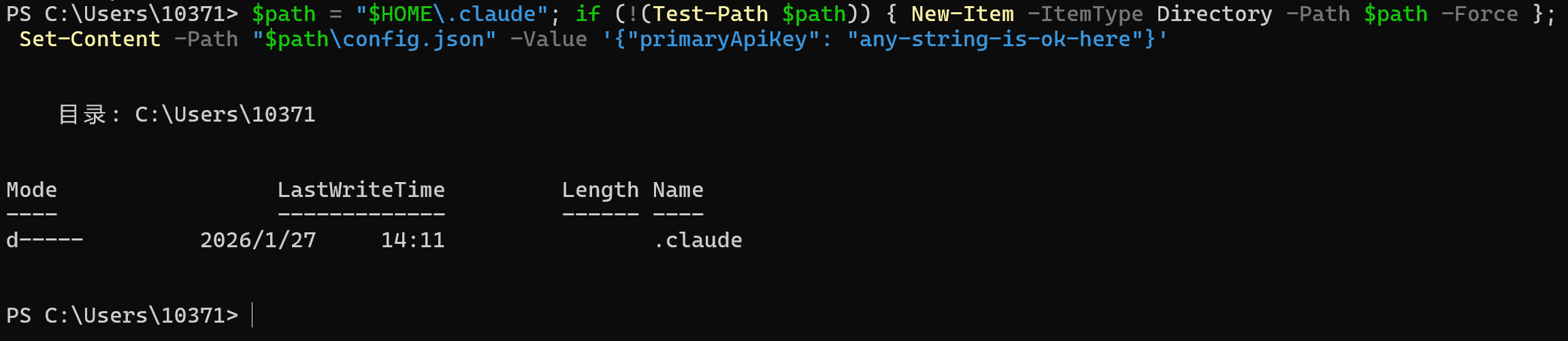 $path = “$HOME\.claude”; if (!(Test-Path $path)) { New-Item -ItemType Directory -Path $path -Force }; Set-Content -Path “$path\config.json” -Value ‘{“primaryApiKey”: “any-string-is-ok-here”}’