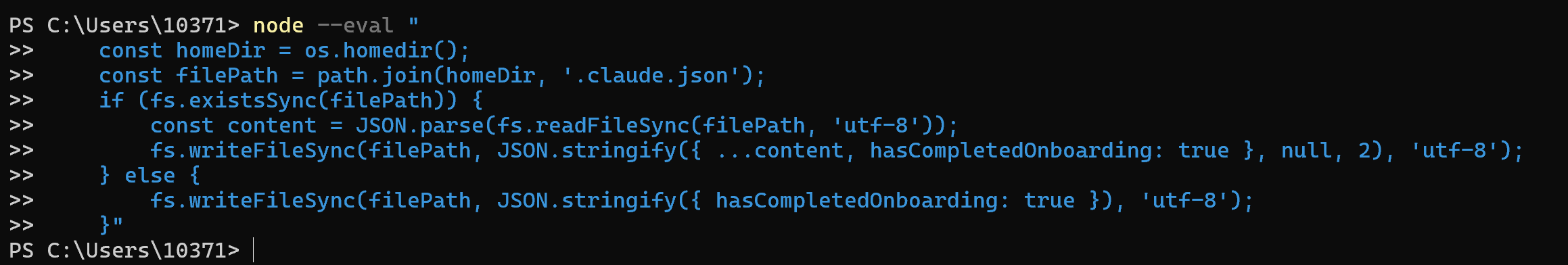 fs.writeFileSync(filePath, JSON.stringify({ …content, hasCompletedOnboarding: true }, null, 2), ‘utf-8’);