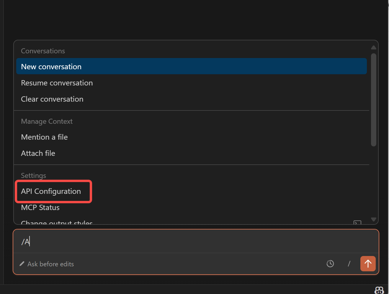 启动后,在 Claude Code 输入框中输入 /,选择 API configuration (或类似 Config 选项),进入配置界面。