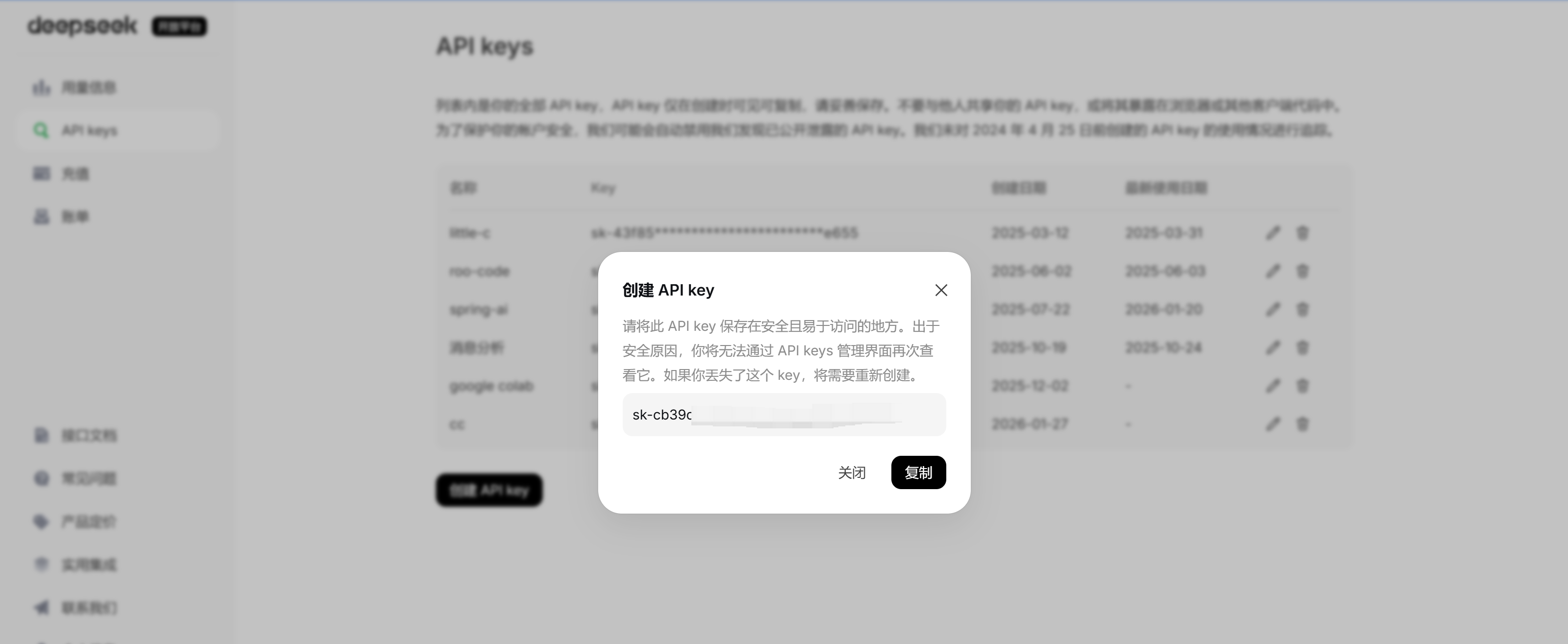 1. 前往DeepSeek开放平台(https://platform.deepseek.com/api_keys)申请 API key。