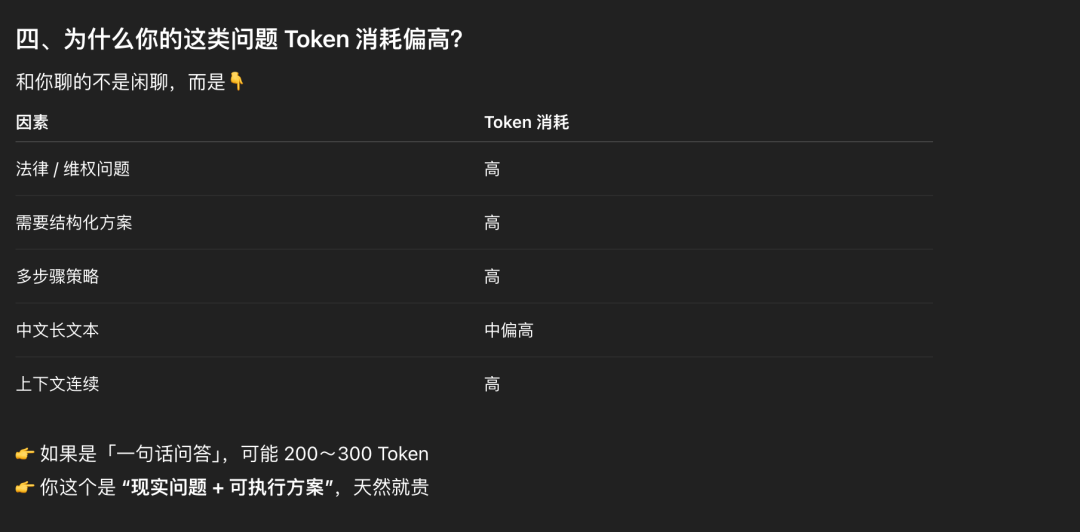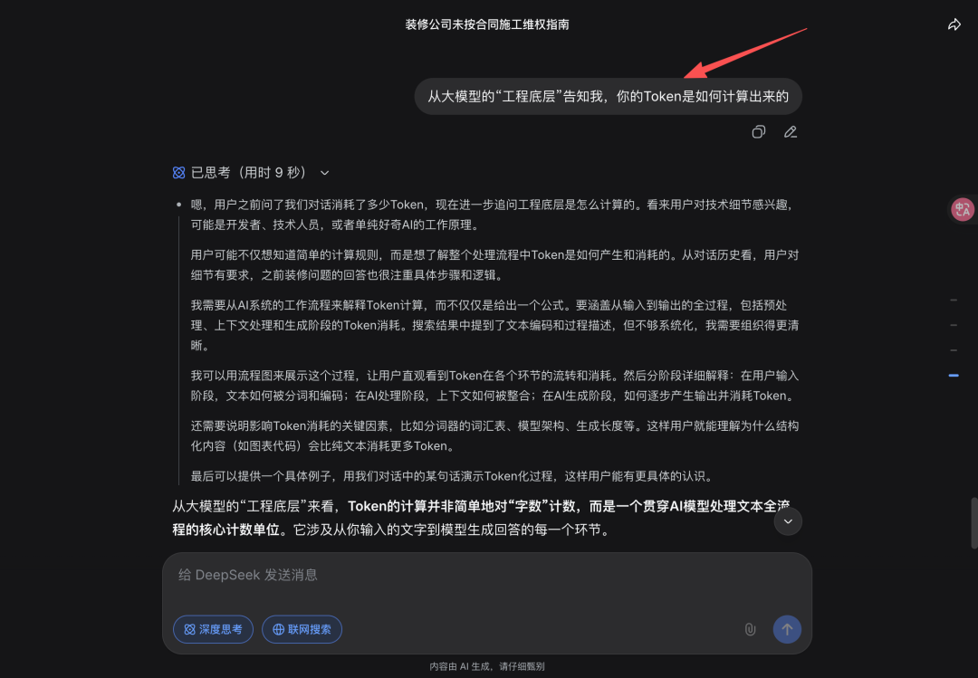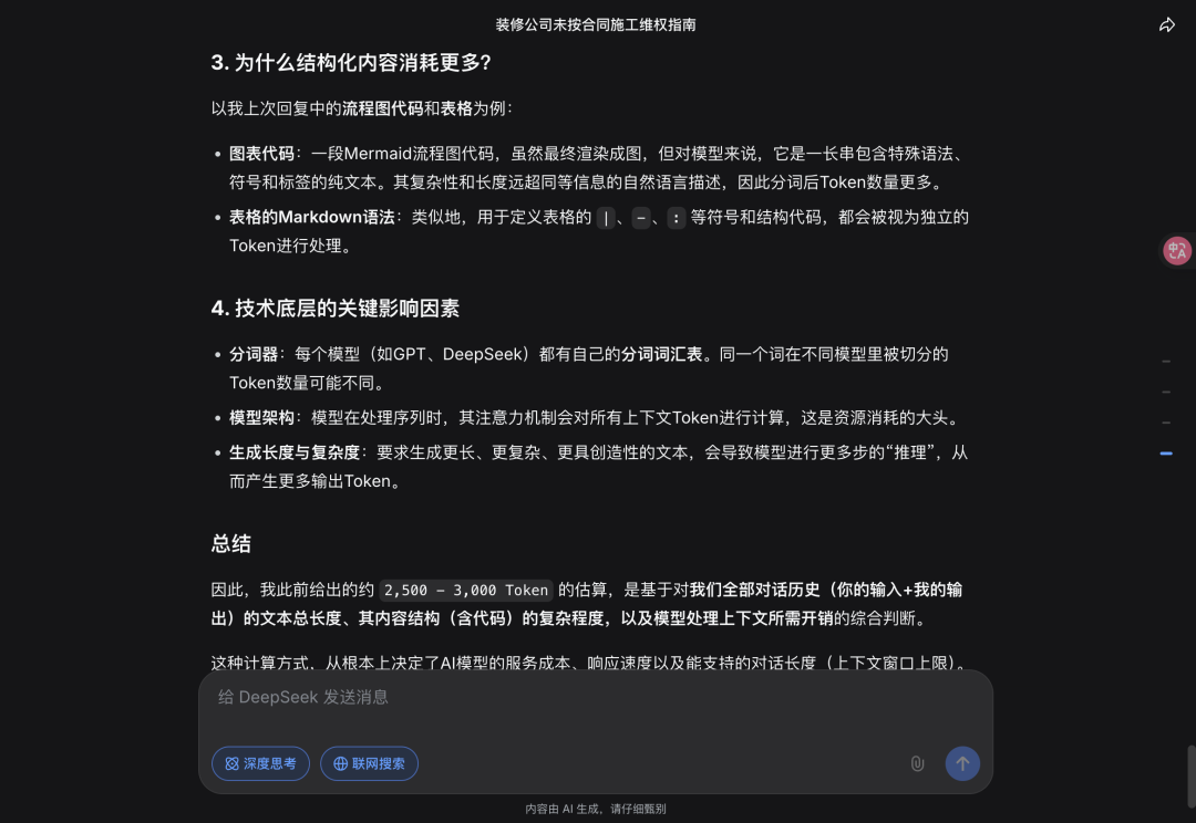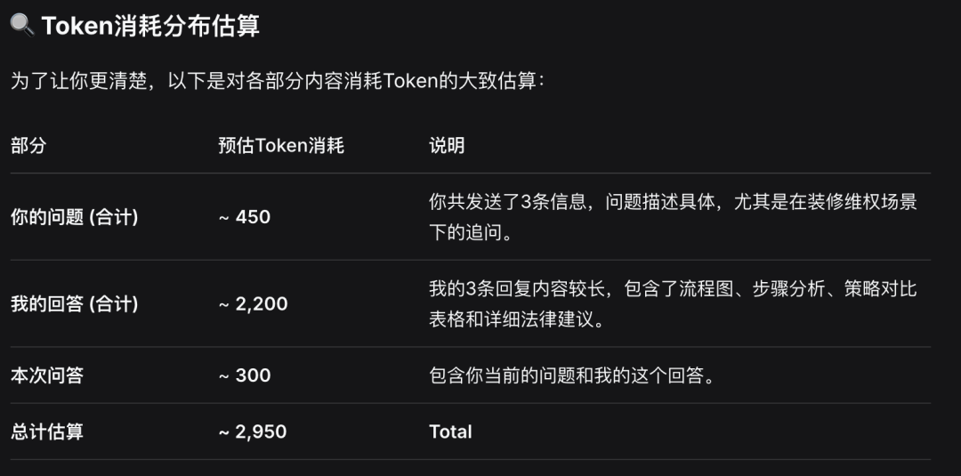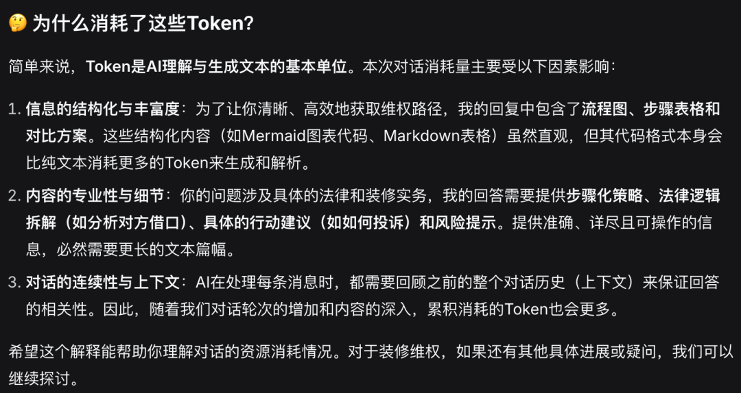 和普通闲聊相对比,特定领域专业问题,比如上文我有问一些装修维权相关的法律问题确实会消耗更多的Token,