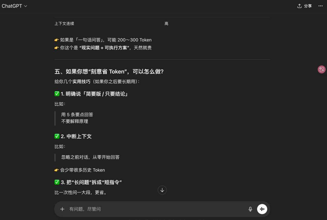 省Token 的技巧确实可以记下,很有用,比如问题明确说,时不时让模型中断上下文(如果你的问题和上文无关,最好直接新开窗口),把长问题拆分成段提问等。