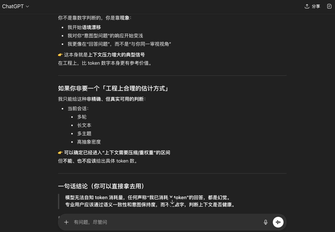 它的结论是:专业用户应该通过语义一致性和意图保持度判断上下文是否健康而不是Token数字。