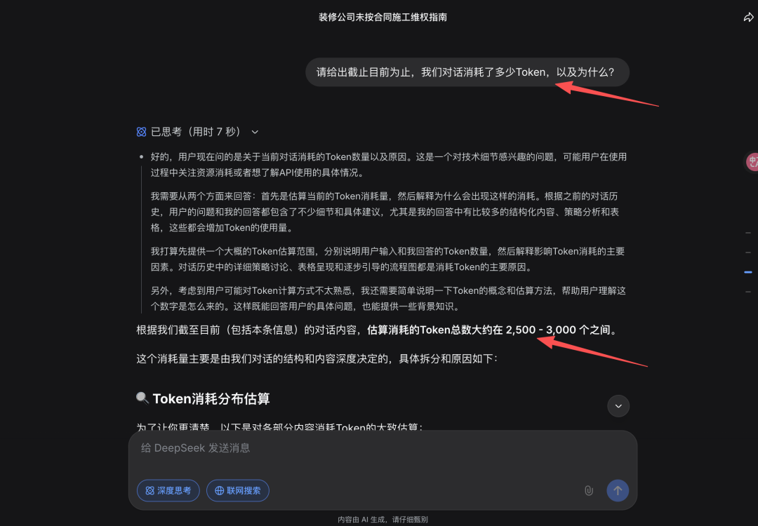 在一个装修违约问题咨询的会话中,我问当前对话消耗Token数量以及原因。